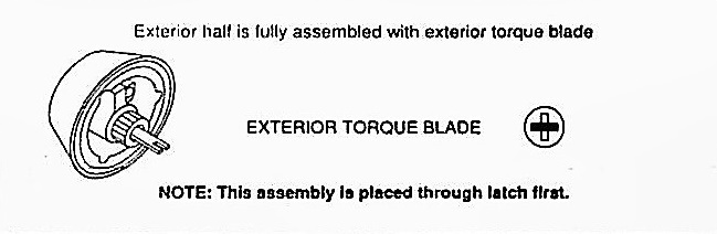 Press interior assembly flush against door making certain the torque blade is properly positioned in latch hole. Key hole should be in the down position.